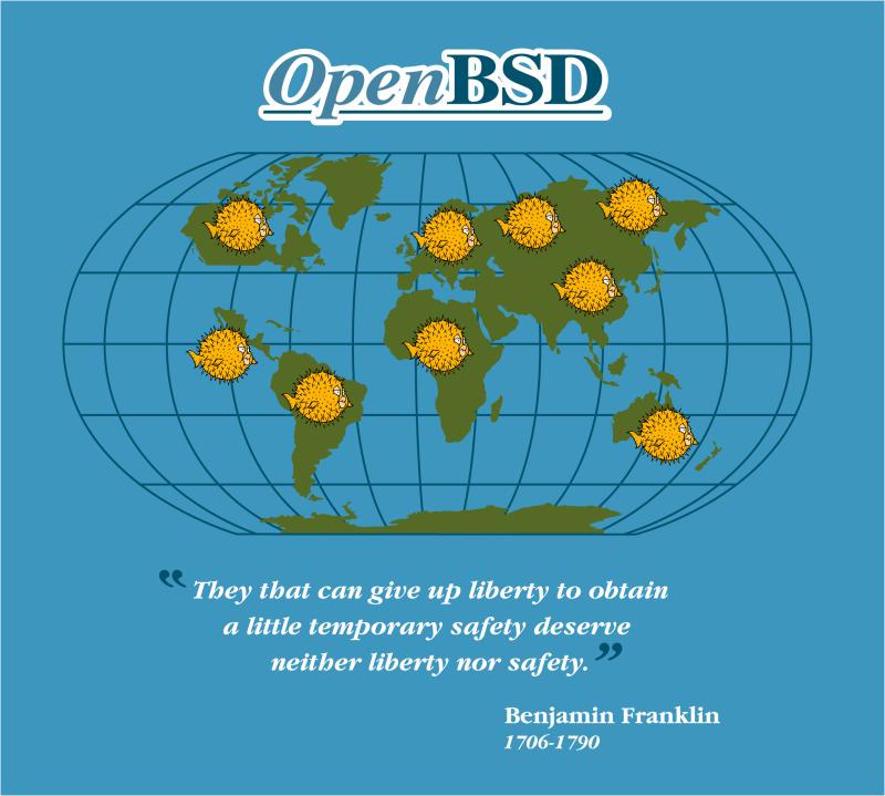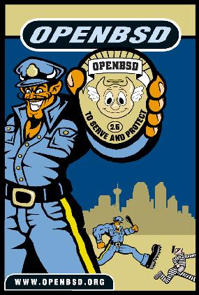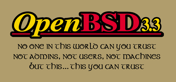 "OpenBSD 3.8" on a brown shirt.