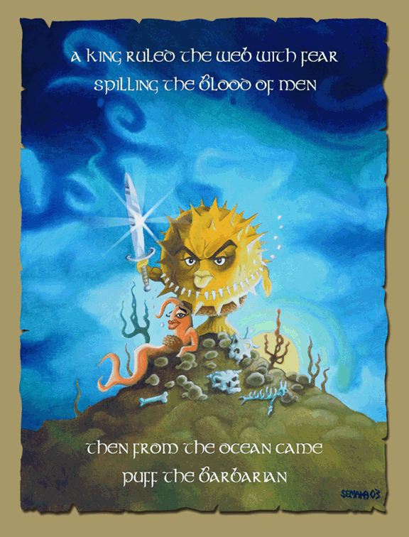 The back features a Frazetta-style painting by Ty Semaka for the "Puffy the Barbarian" theme of the OpenBSD 3.3 release. The front contains a modified quote from the Conan the Barbarian movies.